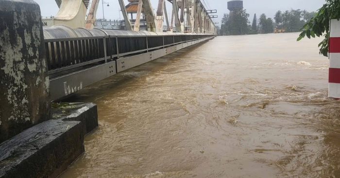 Chiều 27/10, mực nước sông Hương liên tục dâng cao, gây lo ngại cho an toàn của cầu đường sắt Bạch Hổ – cây cầu huyết mạch nối liền tuyến Bắc – Nam qua trung tâm thành phố Huế.