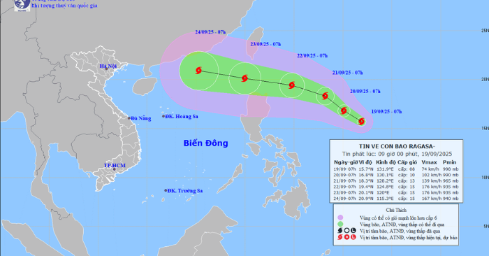 Theo Trung tâm Dự báo Khí tượng Thủy văn quốc gia, sáng 19/9, bão Ragasa cách đảo Luzon (Philippines) khoảng 1.000km về phía Đông, sức gió mạnh cấp 8, giật cấp 10. Dự kiến đến ngày 22/9, bão sẽ mạnh lên cấp 14-15, giật trên cấp 17 và di chuyển theo hướng Tây Tây Bắc.