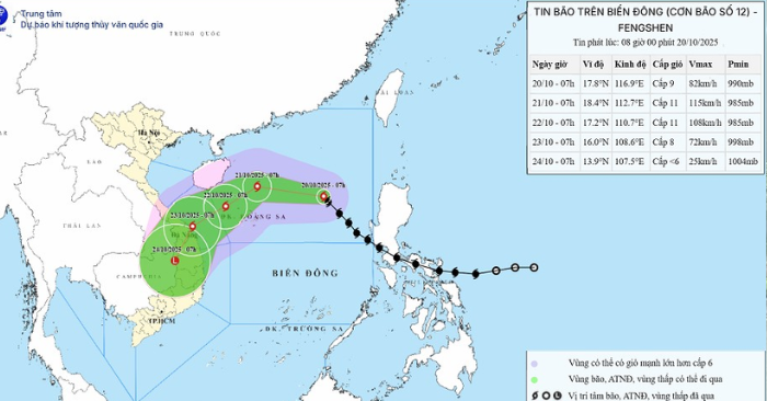 Theo Trung tâm Dự báo Khí tượng Thủy văn Quốc gia, lúc 7h sáng 20/10, tâm bão số 12 ở cách quần đảo Hoàng Sa khoảng 490 km về phía Đông Đông Bắc. Sức gió mạnh nhất vùng gần tâm bão đạt cấp 9 (75 – 88 km/h), giật cấp 11. Dự kiến, bão di chuyển theo hướng Tây Bắc với tốc độ 25 km/h và sẽ mạnh thêm trong 24 giờ tới.