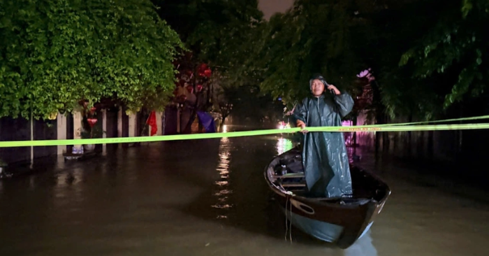 Tại Huế, từ tối 27/10, nhiều tuyến đường nội đô như Lý Thường Kiệt, Bà Triệu ngập sâu; công an địa phương phải điều thuyền đưa người già và trẻ nhỏ lên vùng cao.