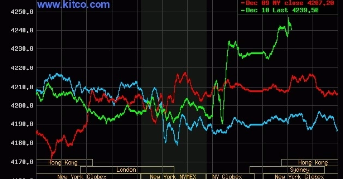 Giá vàng thế giới giao ngay chốt phiên 10/12 tăng 20 USD lên 4.227 USD/ounce, sau khi Fed công bố giảm lãi suất tham chiếu lần thứ ba trong năm, mức 25 điểm cơ bản. Đà tăng mạnh xuất hiện về cuối phiên, bù lại giai đoạn bị bán chốt lời trước đó.