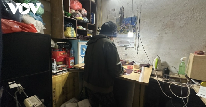 Bà Thoa làm việc trong căn hộ 7m² của gia đình tại 49 Hàng Bạc. (Ảnh: Chụp màn hình báo Dân trí).