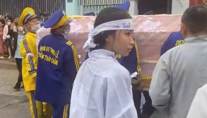 Vợ cũ đứng ngoài sân, lặng lẽ theo con bước lên xe tang