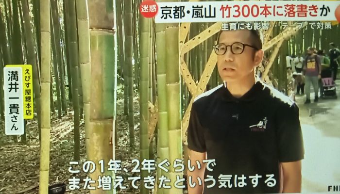 Tình trạng khắc chữ từng được ghi nhận từ năm 2018, khi hơn 100 cây bị hư hại. Sau vài năm lắng xuống, hiện tượng này lại tăng trở lại khi khách quốc tế quay lại Kyoto sau đại dịch. Do đó, giới chức địa phương đang rất lo ngại về tương lai của rừng tre Arashiyama Kyoto.